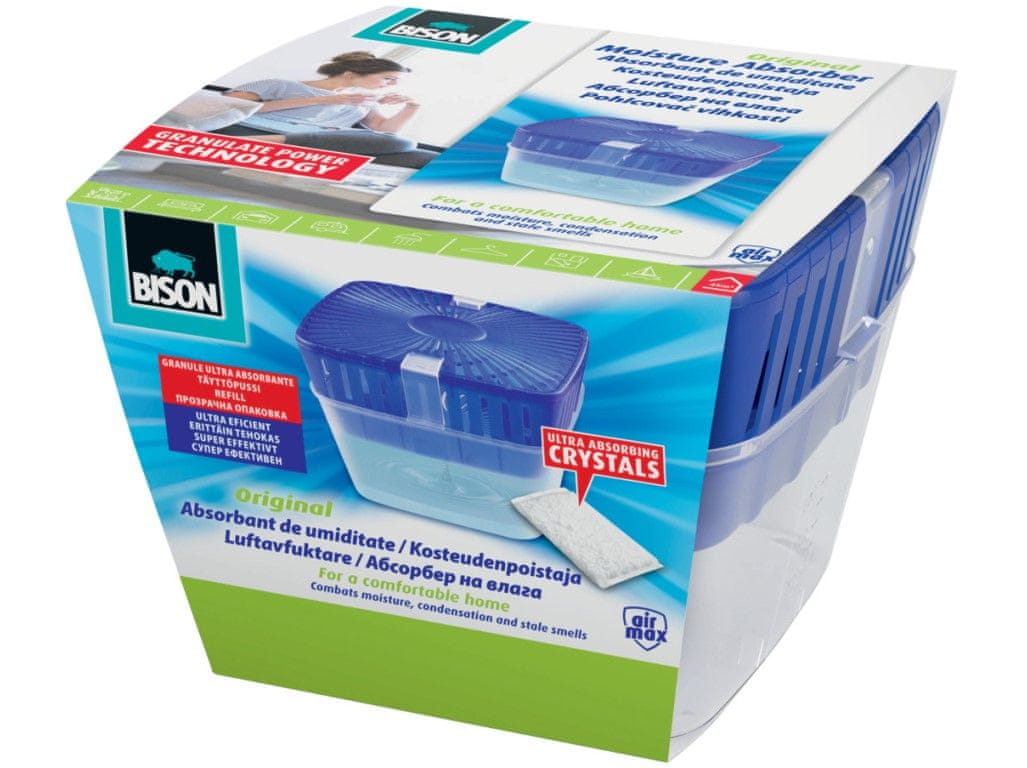 Granulat za absorpcijo zračne vlage absorbira odvečno vlago v normalno mejo, ki znaša 50–60 %. Kristali postopoma absorbirajo vlago in se raztopi. Absorbirana vlaga se odvede v posodo in patentirani pokrovček ne prepušča vode nazaj. Absorber tako preprečuje nastanek plesni, madežev in korozije. Deluje vse leto, je varčen in ga je mogoče ponovno napolniti.