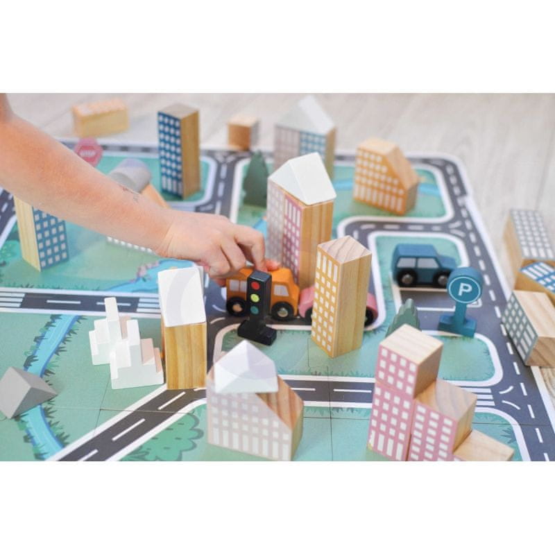 Lesena maketa s kockami priznane blagovne znamke Viga iz serije PolarB je popolna igrača za bodoče arhitekte, ki želijo ustvariti načrt svojega mesta. Razložite maketo in s pomočjo kock različnih oblik in v čudovitih pastelnih barvah zgradite mesto! Možnosti ustvarjanja mesta so res številne, zato zabavi ne bo videti konca! Idealno za darilo.