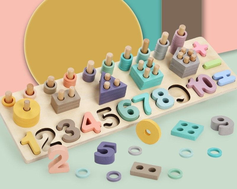 Otroci bodo s to igro šteli in razvrščali barvne obročespoznavali števila in oblike likov. Sestavljanka je narejena iz okolju prijaznega lesa, pobarvana z kvalitetnimi nestrupenimi barvami in ustrezajo zahtevam CE.