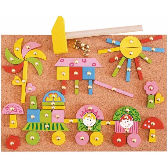 Z tem kompletom lahko otroci s pomočjo kladiva in žebljev ustvarijo neskončne različice domiselnih slik. Delo s kompletom spodbuja domišljijo, koncentracijo in natančno koordinacijo gibov