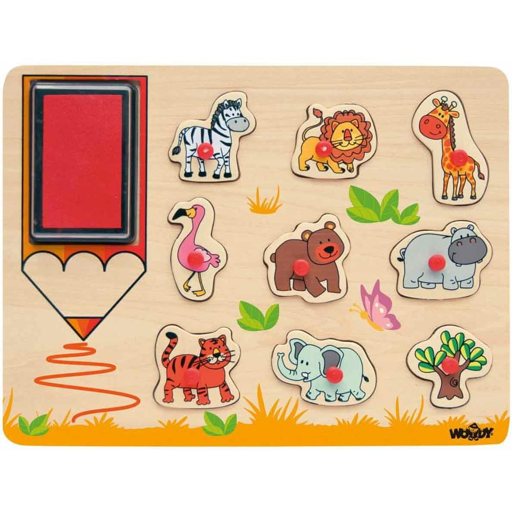 Kombinacija znamk in ugank Na dnu vsake živali je gumijast žig Na površini tega izdelka boste našli barvno blazinico zanje Otroci lahko pobarvajo natisnjene živali in sestavijo celotne slikovne kompozicije