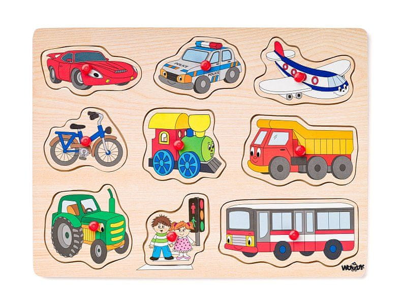 Puzzle WOODY Puzzle Vozila Posamezna vozila se vstavijo v ustrezne luknje s pomočjo ročajev 9 kosov Starost 2+ Velikost 30 × 21 cm Celoten opis