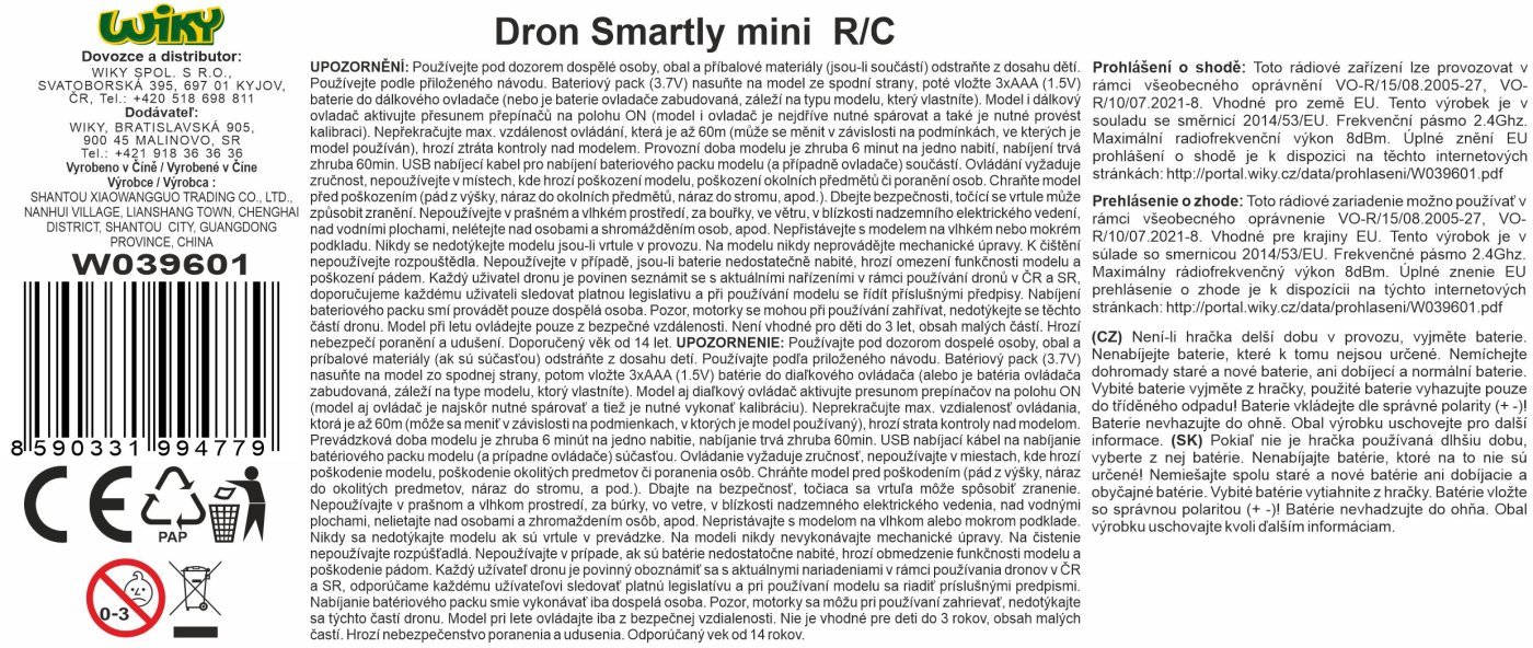 Smartly mini zložljiv RC dron na daljinsko upravljanje. Brez kamere. Dimenzije 14×13×4 cm, zložen 5,5×6,5×3,5 cm. 3,7V 400mAh baterija za dron je vključena, 150mAh baterija za krmilnik ni vključena. Priložen je kabel USB. Delovanje 6–7 min, polnjenje 60 min, doseg krmilnika 60–80 m. Funkcije – izogibanje oviram, premikanje na mestu, obračanje za 360 stopinj, vrnitev v začetni položaj. Gumb za vklop/izklop na dronu in na krmilniku. Samo modra barva. Frekvenca 2,4 GHz.