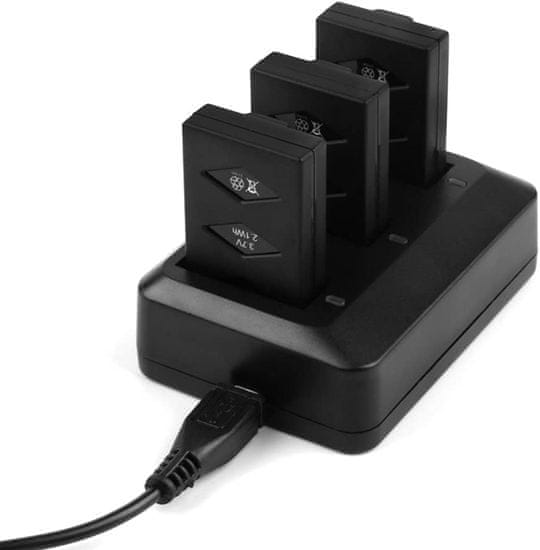 • Li-Po polnilec z zaščito vezja IC v vsaki polnilni vtičnici, lahko naenkrat polni 1, 2 ali 3 baterije, kar prihrani veliko časa za polnjenje
