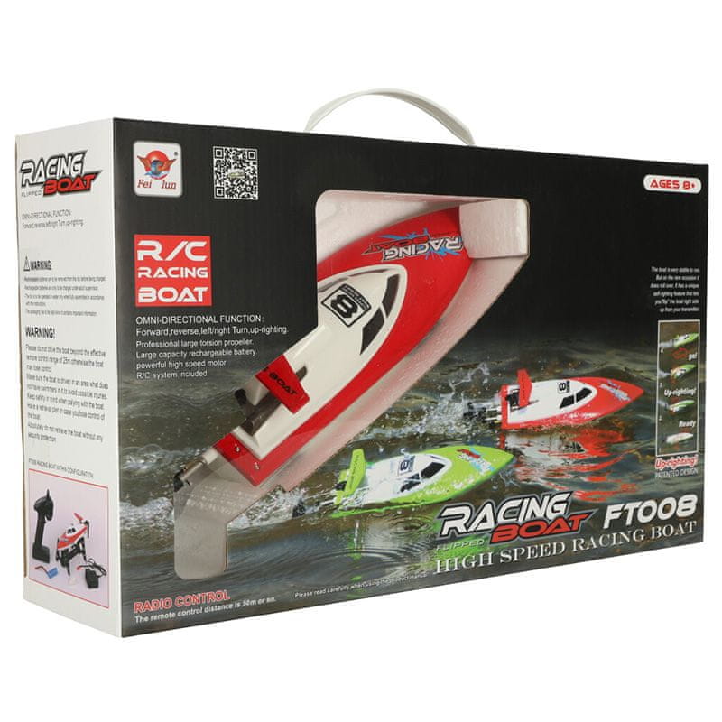 Motorni čoln na daljinsko vodenje Racing Boat / High Speed FT008 Motorni čoln na daljinsko upravljanje je odlična zabava tako za mlade kot tudi za starejše ljubitelje vodnih motošportov. Okreten in izjemno hiter model, izdelan iz trdnega materiala. Verjetno vsak fant sanja o tem, da bi sodeloval na kakšnem dirkalnem tekmovanju. Zdaj je to mogoče, lahko se preizkusite v vodnih motornih športih. V celoti bomo izkoristili manevriranje in hitrost motornega čolna na velikem odprtem vodnem območju. Je zelo enostaven za vožnjo in izgleda odlično. Čustva zagotovljena! Odlična izvedba! Napredna tehnologija! Učinkovita oblika, hitro glisiranje, močna turbina in močno krmilo omogočajo čolnu največjo hitrost do 14 km/h. Motorni čoln je izdelan iz trpežnih materialov in kovinskih prenosnih elementov. Uporabljeno je pravo mehansko „servomehanizem“ krmilo, zaradi katerega je motorni čoln okreten in se obrača v vseh pogojih, ne glede na moč motorja. Zasnova motornega čolna je pravilno uravnotežena, tako da se po prevrnitvi vedno obrne s trupom navzdol. . Za ekstremno plavanje je vredno namestiti tudi odbijač na trup, da preprečite poškodbe. Vsa elektronika varno skrita v kokpitu čolna. Vsi priključki so zavarovani s tesnili, ki preprečujejo vdor vode v notranjost. Popoln nadzor! Krmiljenje motornega čolna je v obliki pištole, kar omogoča udobno upravljanje čolna. Kontrolniki so zelo enostavni za uporabo. Zato lahko ta model vsekakor priporočamo otrokom. Motorni čoln je radijsko voden na frekvenci 27 Mhz, kar daje spodoben domet do 25 m in omogoča neomejen prehod skozi vode. Krmilnik se zelo dobro prilega roki in je enostaven za uporabo: 1. Pritisnite sprožilec krmilnika, da se čoln zažene naprej. 2. Če pritisnete sprožilec stran od sebe, bo čoln lebdel nazaj. 3. Kolo na desni strani krmilnika se uporablja za obračanje ladje. Zasidrajte svojo ladjo! Ko nimate časa ali je slabo vreme, poskrbite za svoj čoln! S postavitvijo motornega čolna na posebno stojalo zaščitite trup pred poškodbami, hkrati pa imate odličen eksponat, ki vam ga bodo prijatelji zavidali. Poleg motornega čolna daljinski upravljalnik vsebuje še: – vzdržljivo baterijo 3,7 V, kapacitete 700 mAh, – USB kabel – priklopno stojalo, – zaščito, odbijač za premec čolna, – rezervni propeler, – baterijo za daljinski upravljalnik. Motorni čoln se lahko zažene samo na vodni gladini!! Ko pritisk vode nastane skozi majhne luknje v čolnu, je motor pripravljen. Hkrati vklopite krmilnik. Rdeča lučka sveti in zelena utripa. Ko zelena lučka preneha utripati, je bila frekvenca kodirana in lahko uživate v zabavi. Komplet vsebuje baterijo in polnilec. Dimenzije. pakiranje: 38,5 cm x 10,5 cm x 22 cm