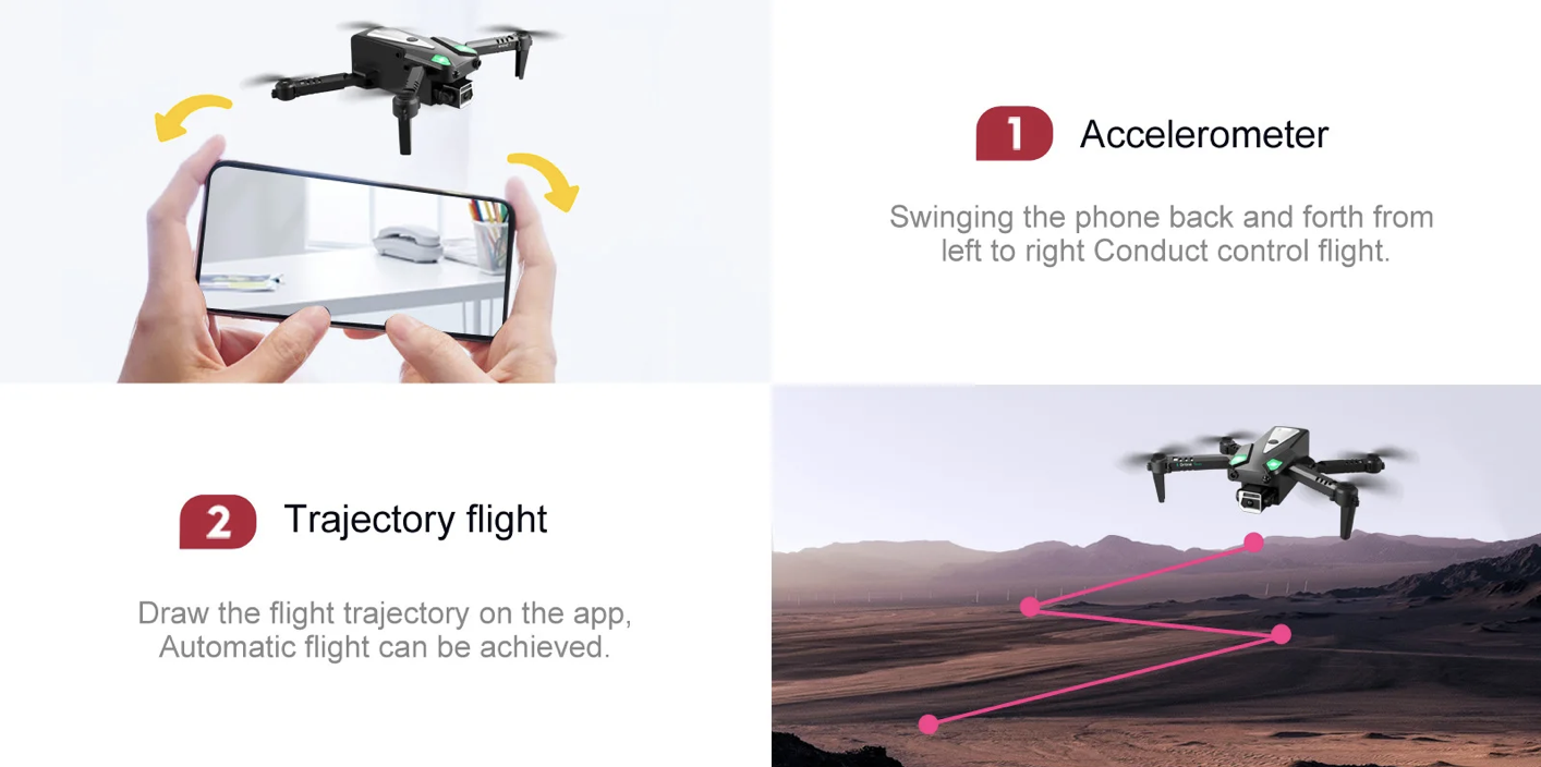 • dodane funkcije, kot so fotografiranje z gestami, snemanje videoposnetkov, način letenja brez glave, ustavitev v sili, trajektorija leta, zaznavanje težnosti, samodejno fotografiranje s kamero.