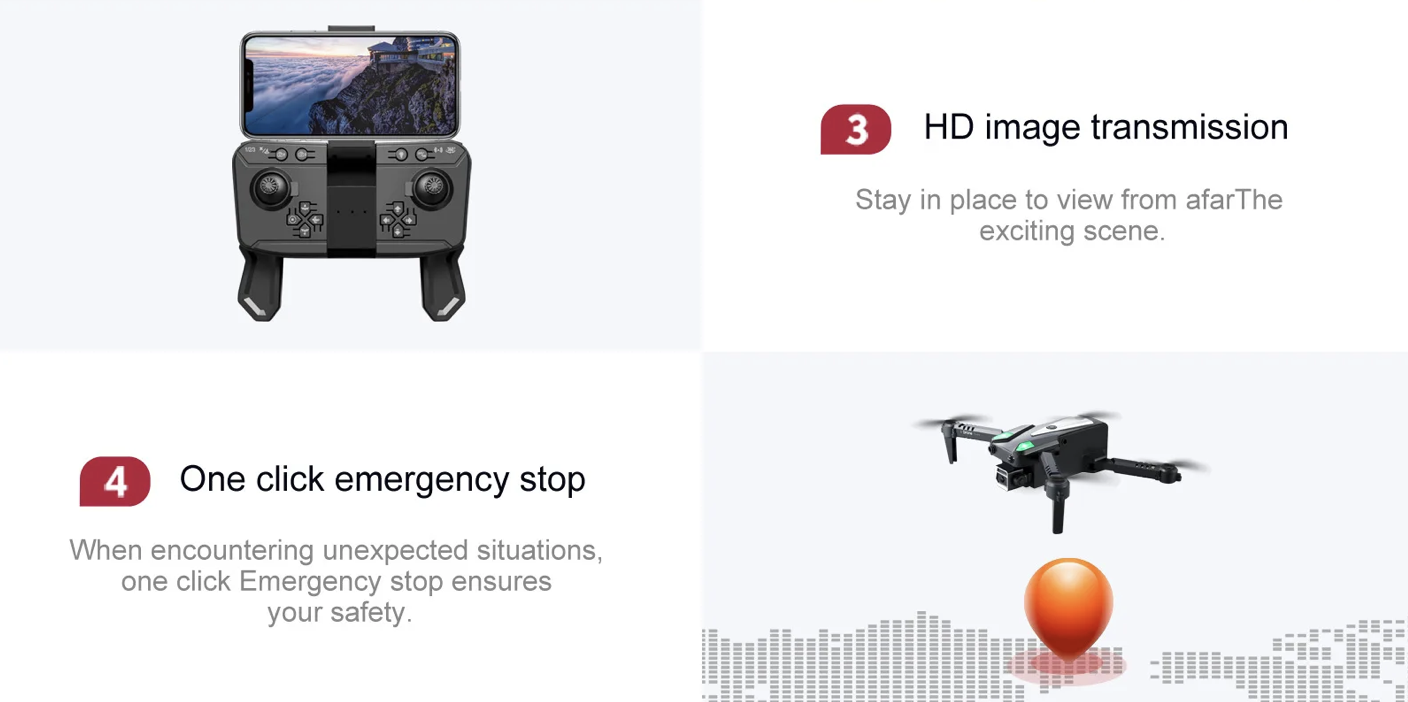 • univerzalni nadzor: Dron lahko preprosto upravljate s priloženim daljinskim upravljalnikom ali aplikacijo na pametnem telefonu.