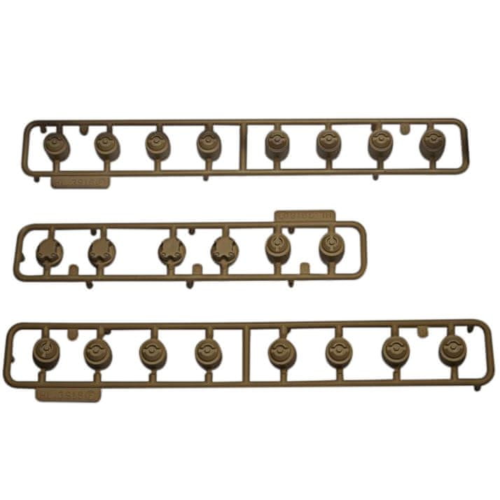 3918–021-F POKROVI KOLES 3918 Komplet pokrovov koles za tank 3918 Abrams M1A2 Originalni rezervni deli Heng Long zagotavljajo pravilno delovanje modela. Količina: 3 okvirji (22 pokrovov koles) Barva: Peščena Material: Plastika