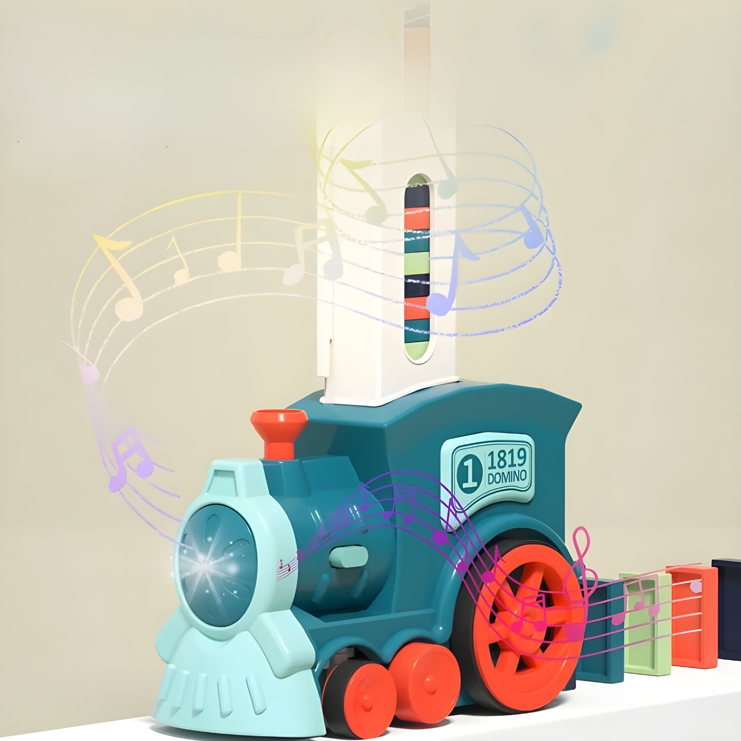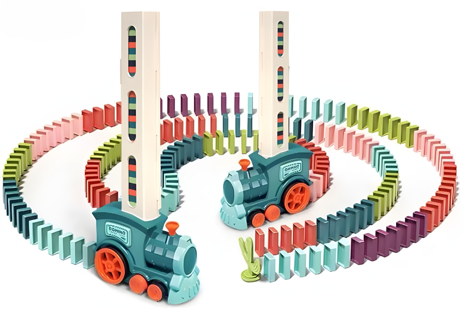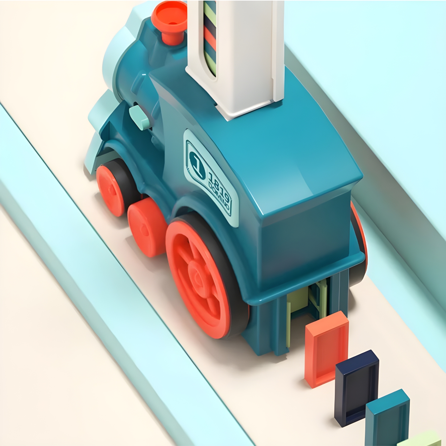 Z vrtenjem dimnika lahko vaš malček nastavi tire vlaka. Lokomotiva se lahko vrti v krogih v smeri urinega kazalca, v nasprotni smeri urinega kazalca ali gre naravnost . To omogoča vlaku, da z dominami ustvarja različne privlačne vzorce.