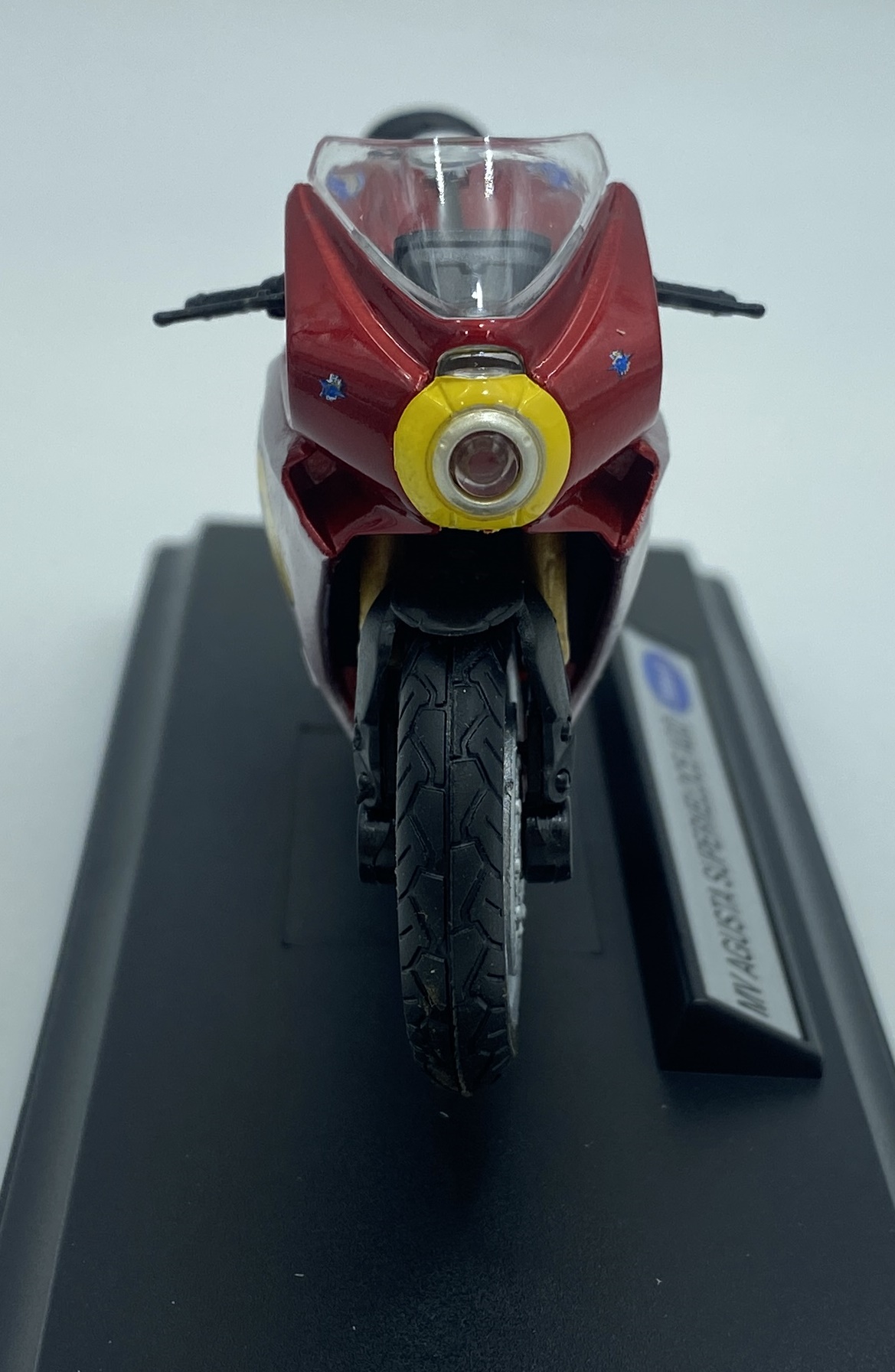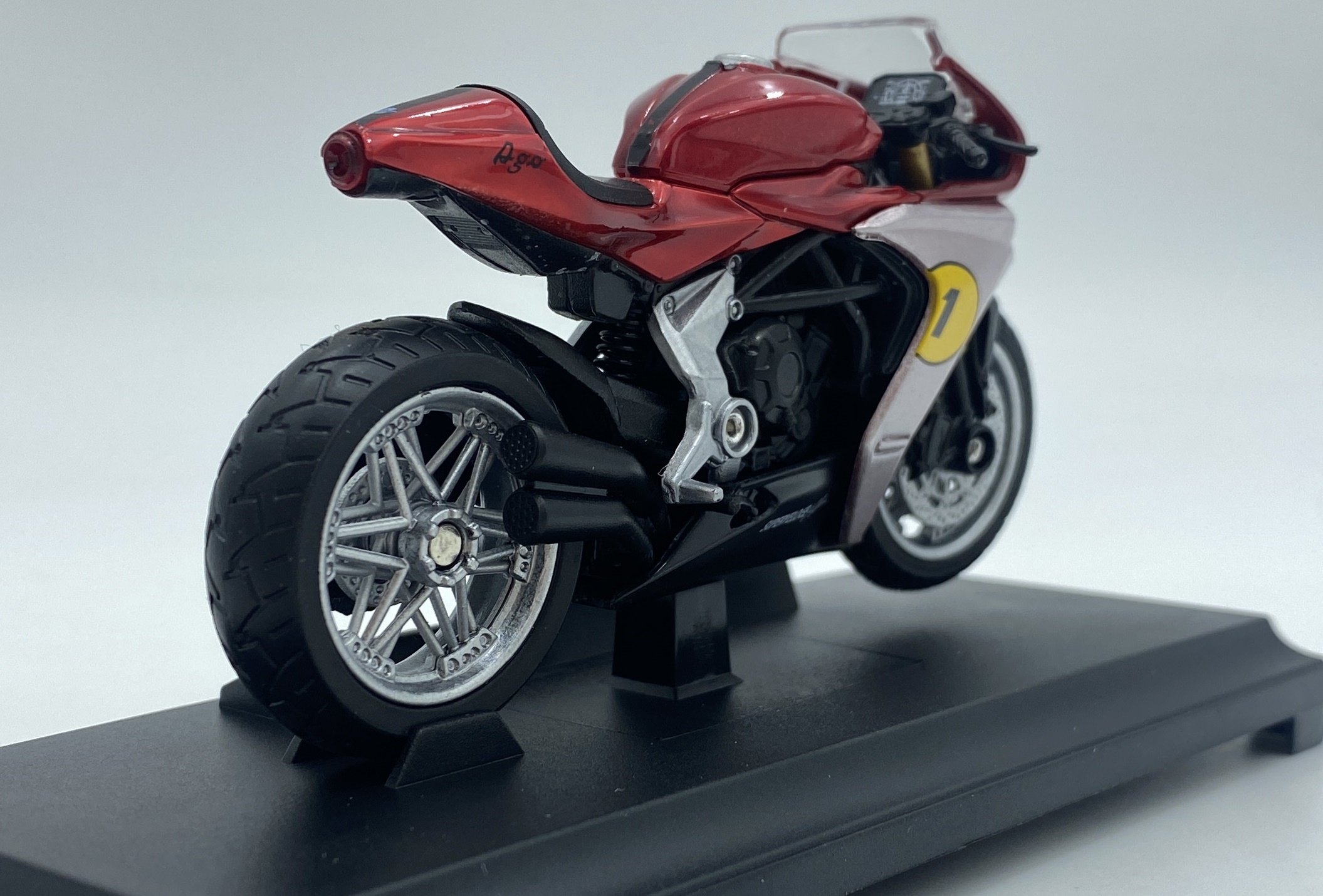 Model v škatli s stojalom za razstavljanje z imenom motornega kolesa. Motocikel je mogoče odstraniti s stojala – en vijak.
