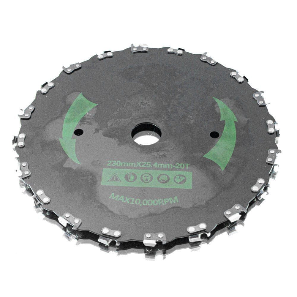 VERIŽNI DISK ZA TRIMERJE Univerzalni verižni disk za različne vrste trimerjev in bencinskih motornih kos. Disk s premerom 230 mm in rezalnimi zobmi je idealen za urejanje vrta. Disk je kot nalašč za obrezovanje grmovja, dreves ali za odstranjevanje nezaželenih samosevnih rastlin. Disk je mogoče prilagoditi tako profesionalnim in vrhunskim trimerjem kot tudi najbolj priljubljenim bencinskim motornim kosam. Priporočamo tudi trimer BITUXX. Lastnosti izdelka: – močan in vzdržljiv – nemška blagovna znamka – univerzalen – za obdelavo lesa – verižni disk – premer 230 mm Tehnični podatki: – Premer: 230 mm – Členi verige: 20 – Luknja v kolutu: 25,4 mm – Največji obrati: 10.000 vrt/min – Premer rezila: 228 mm – Material: jeklo – Teža: približno 543 g Priloženo: 1× rezalna glava z verigo 228 mm