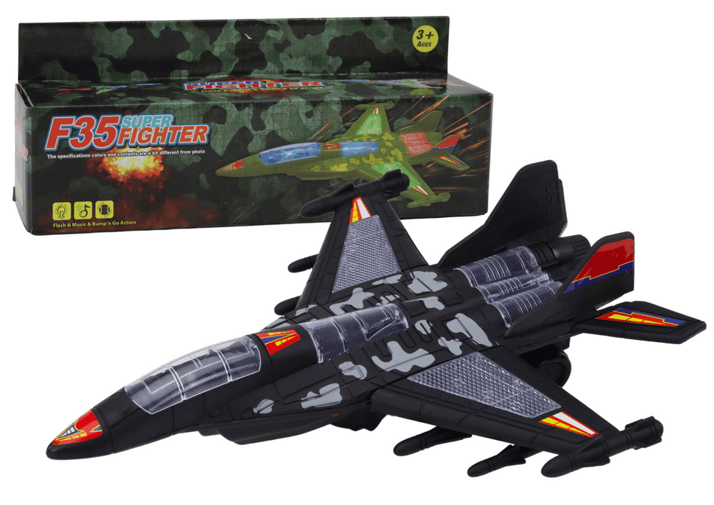 F35 Military Fighter Driving Lights Sounds Black Radi bi vam predstavili črnega lovca brez konkurence, ki vas bo popeljal v fascinanten svet letalskih dogodivščin kot še nikoli prej! Ko vklopite našega lovca, se pripravite na resnično spektakularno potovanje. Začne se premikati z eleganco in samozavestjo, iz zvočnika pa prihajajo zvoki, ki vas bodo potegnili v nevarne zavoje in dinamične manevre. Slišali boste ropot motorjev, šumenje vetra in zvoke letenja skozi oblake. Naš lovec je opremljen tudi z nenavadnimi, večbarvnimi lučmi, ki izžarevajo iz krova, kar mu daje edinstven sijaj in osupljiv vizualni učinek. To ni le igrača, je prava mojstrovina tehnologije in dizajna. Najpomembneje pa je, da je naš lovec opremljen z napredno senzorsko tehnologijo, ki mu omogoča, da se odziva na okolico. To pomeni, da se lahko inteligentno izogne oviram tako, da spremeni smer, vaši igri doda pristnost in pristnost. Fighter se napaja s 3× 1,5V AA baterijami, ki niso priložene v kompletu. Dimenzije lovca: 30 cm x 24 cm x 9,5 cm Dimenzije embalaže: 30 cm x 12 cm x 8 cm Certificiran CE in skladen s standardom EN71. Namenjeno otrokom starejšim od 3 let.