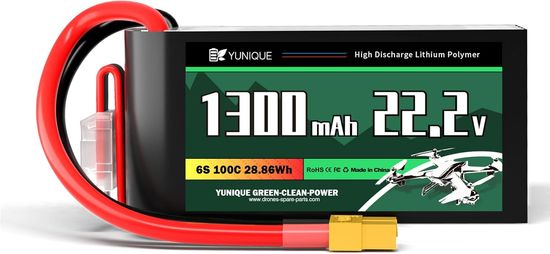 YUNIQUE GREEN-CLEAN Lipo baterija 6 celic 22.2V 1300mAh 100C s priključkom XT60, silikonskim kablom in mehko lupino - dimenzije 74x38x38 mm, teža 265g - visoka moč za RC modele