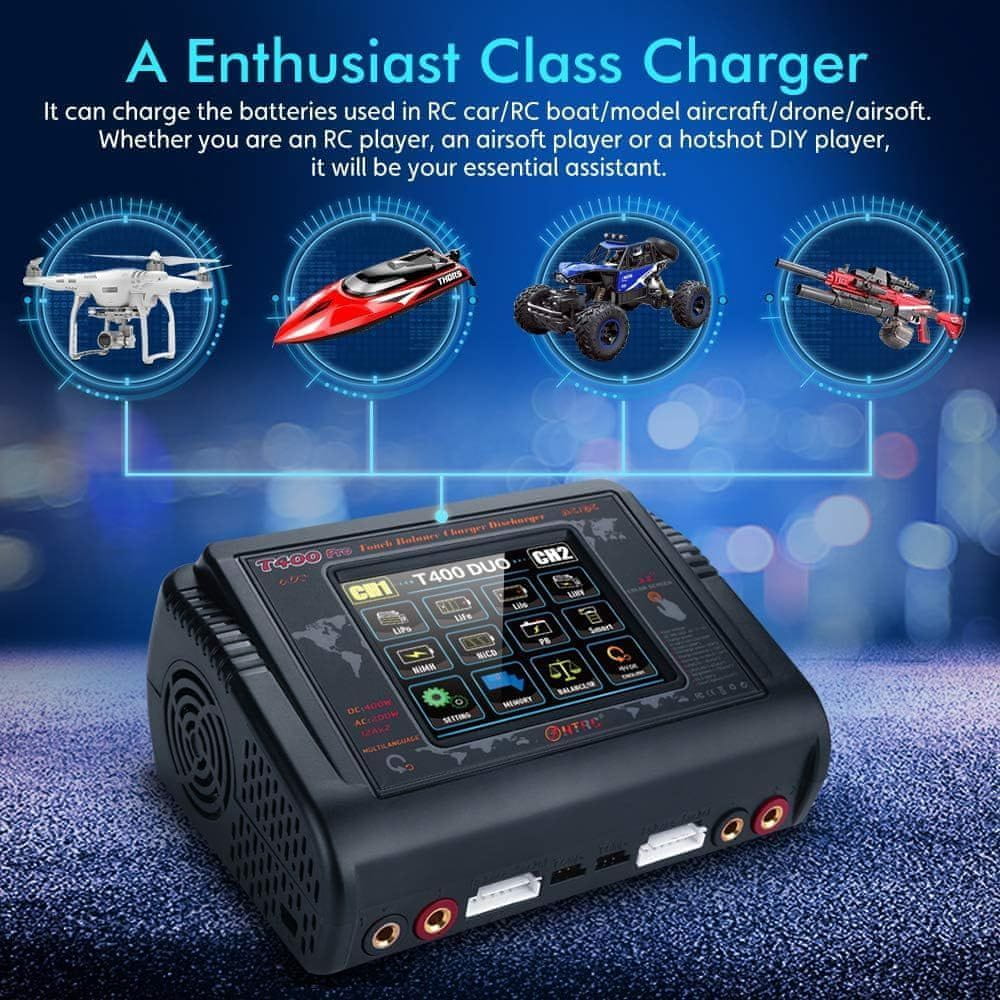 Polnilec T400 Pro je profesionalni polnilec/izpraznilnik, zasnovan za izpolnjevanje zahtev po polnjenju najpogostejših baterij, ki se uporabljajo v modelarstvu in RC napravah. Z največjo močjo 400 W v načinu DC in 200 W v načinu AC omogoča T400 Pro hitro in uravnoteženo polnjenje na dveh kanalih hkrati do 12 A na kanal. Združljiv je s široko paleto baterij: LiHV, LiFe, Li-ion, NiCd, NiMh, Pb in LiPo, zaradi česar je idealna izbira za RC avtomobile, drone, letala in druge elektronske naprave.