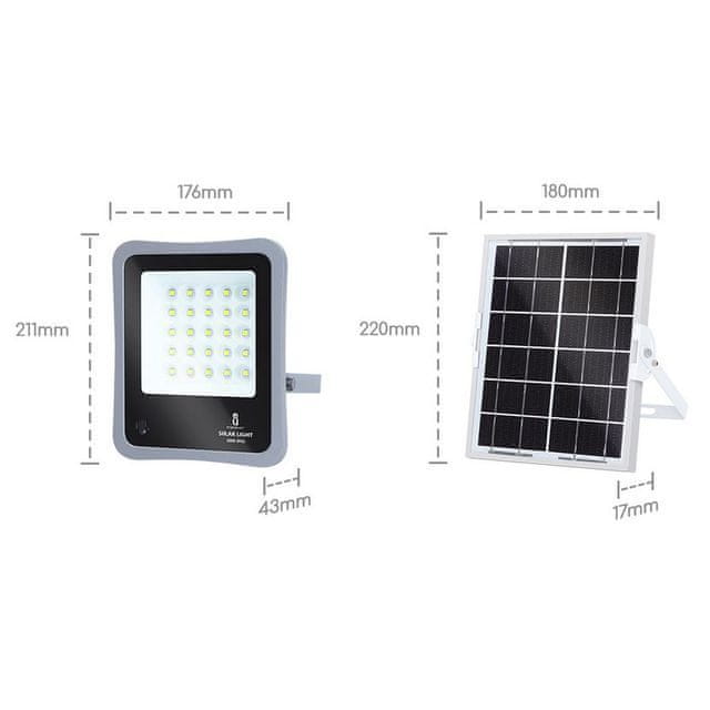 Barva izdelka: sivaVelikost: D: 176 x Š: 211 x V: 43 mmVelikost solarnega panela: D: 180 x Š: 220 x V: 17 mmDomet: 3–4mŽivljenjska doba baterije: cca. 3 letaMoč LED: 30WStopnja zaščite: IK07, IP65Moč solarnega panela: 6WNapetost solarnega panela: 5VNapetost: DC 3,2VTok: 625 mABarvna temperatura: 6500k hladno bela svetlobaSvetlilnost: 400 lmCRI: > 70 RaKot osvetlitve: 90°Delovna temperatura: –10 ℃ ~ 50 ℃ Set vsebuje:Led reflektor + nosilec,solarni panel + nosilec,daljinski upravljalnikInteligentni daljinski upravljalnik: čas osvetlitve, nadzor svetlosti.Tri nastavitve osvetlitve: 3 ure / 5 ur / 8 ur,