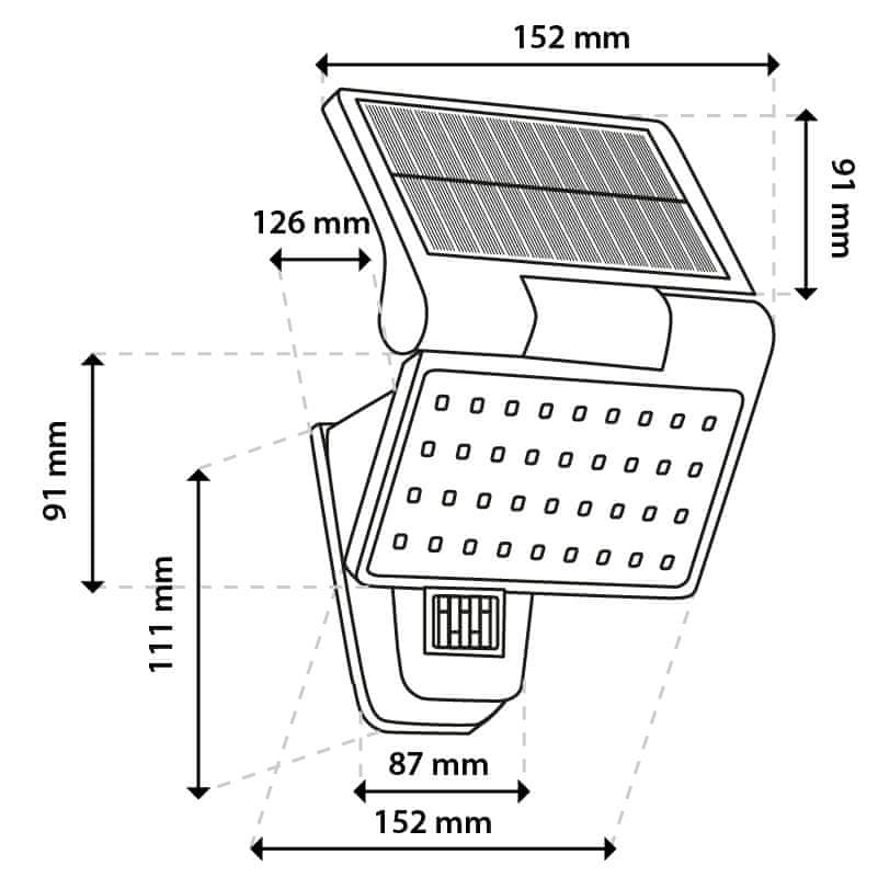 • Dodatne funkcije:   vgrajen solarni panel, vgrajen senzor gibanja in mraka, vgrajeno mehansko stikalo za VKLOP/IZKLOP, možnost nastavitve vpadnega kota svetlobe
