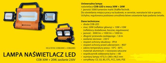 Večnamenska svetilka, reflektor COB-LED s 30 vati in dodatnimi 20 vati ter 5000 lumni svetilnosti podjetja ShäfferTechnik za osvetlitev delovnega mesta na gradbišču, v servisni delavnici, delavnici ali garaži. Nagibno, nastavljivo podnožje omogoča enostavno prilagajanje vpadnega kota svetlobe