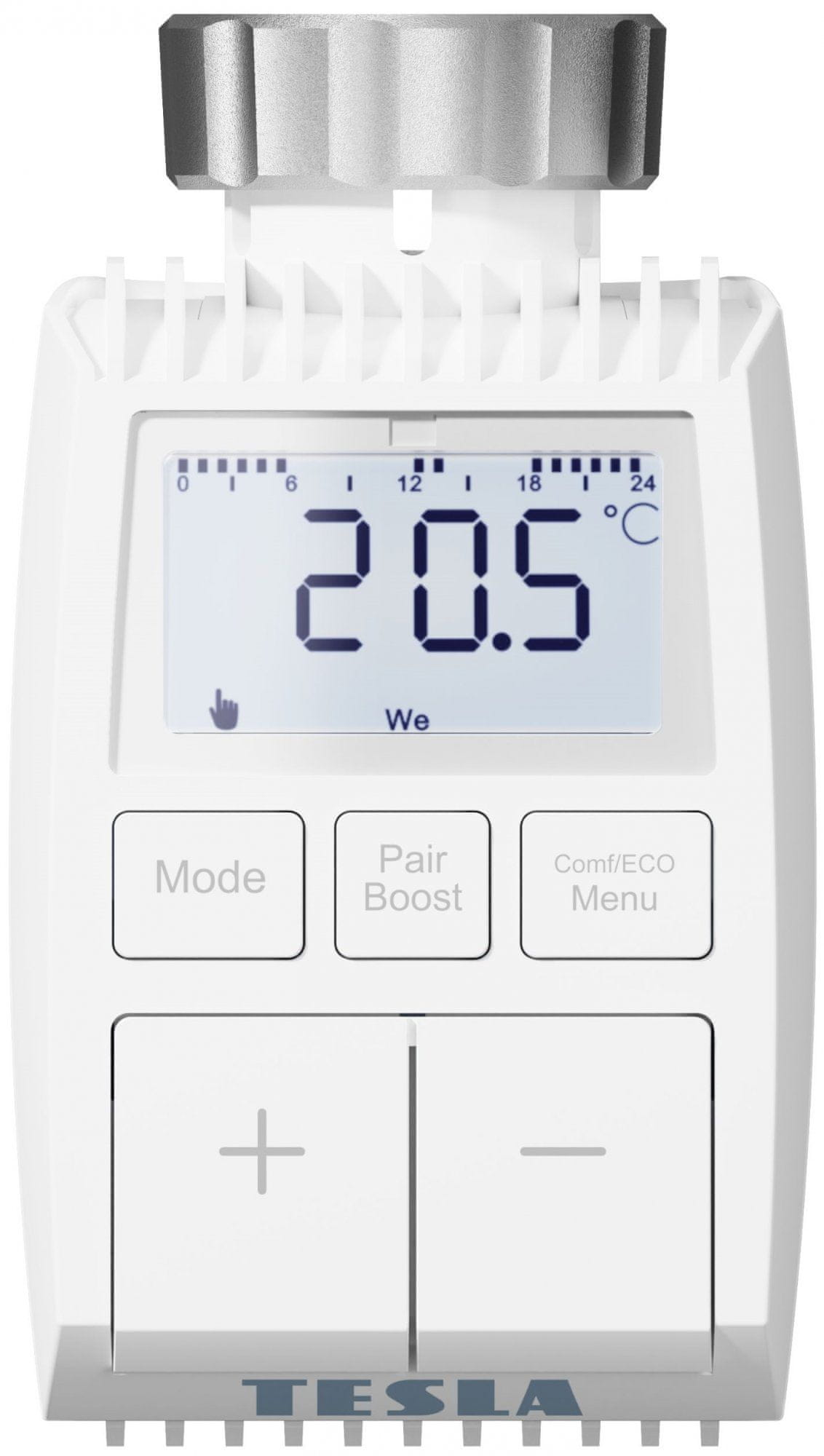 Pametni termostatski ventil uravnava delovanje radiatorja in s tem pripomore k zmanjšani porabi energije, brez kompromisa glede udobja in toplote. Lahko deluje popolnoma avtonomno ali pa ga ročno upravljate z gumbi ali preko aplikacije. Neprekinjeno spremlja temperaturo okolja, zaradi česar lahko zazna odprta okna in temu primerno prilagodi delovanje, da prepreči nepotrebno ogrevanje in posledično zmanjša porabo. Zahvaljujoč enostavno berljivemu LCD zaslonu in velikim gumbom je upravljanje popolnoma enostavno. Za še bolj napredno upravljanje lahko ventil preko aplikacije Tesla Smart dostopa do vaše lokacije in samodejno poveča temperaturo, ko se bližate domu.