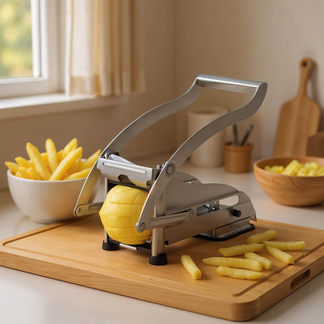 EVA REZALNIK KROMPIRJA je izdelan iz trpežnega nerjavečega jekla in je idealen za varno in hitro rezanje krompirja. Priloženi so trije nastavki z odprtinami različnih velikosti: 12 × 12 mm, 10 × 10 mm in 9 × 9 mm. Preprosto vstavite krompir in spustite ročico. Celoten opis