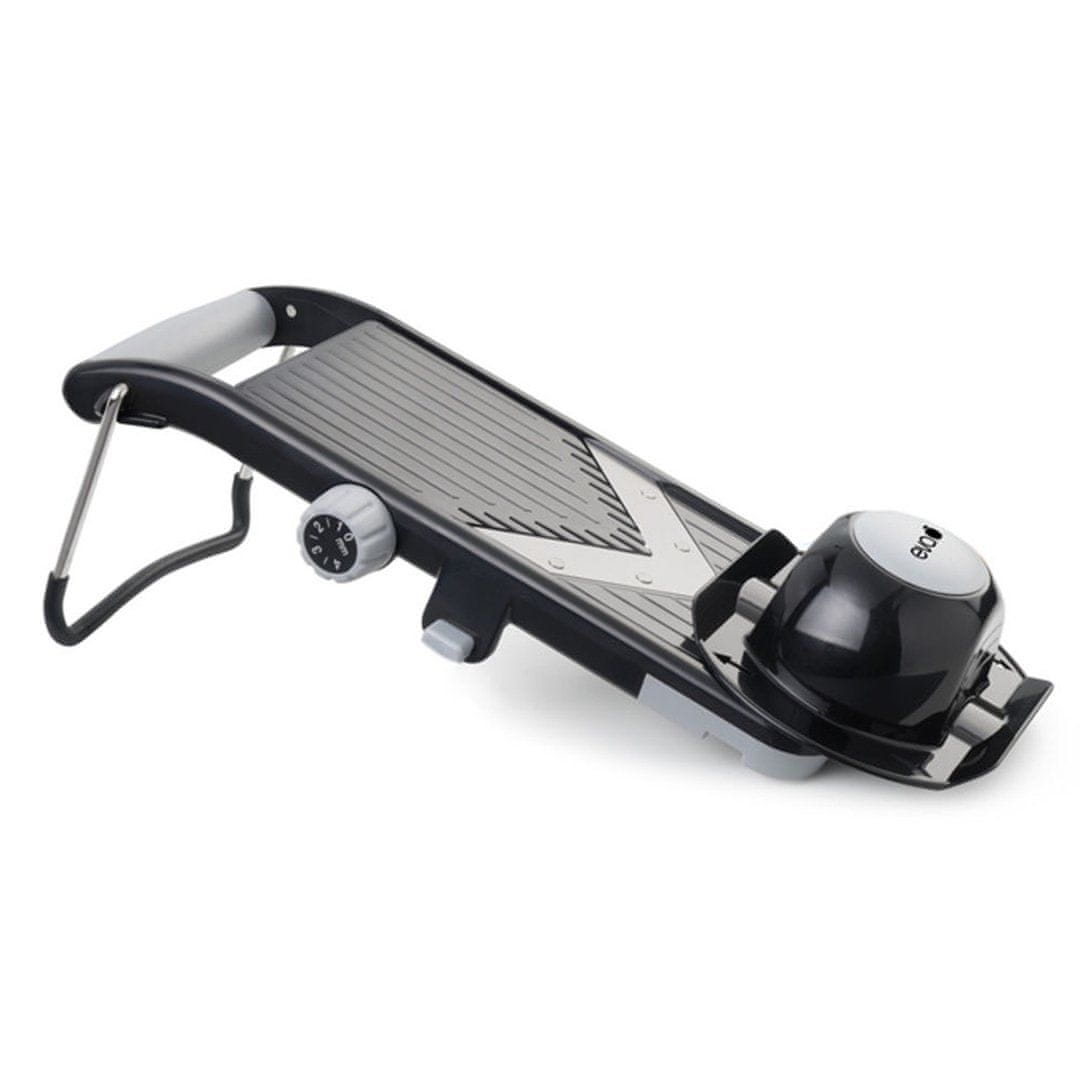 Kompaktna mandolina Eva z rezilom v obliki črke V in z integriranimi ostrimi rezili je primerna za rezanje zelenjave, sadja in ostalih živil. Z vrtenjem na gumb spreminjate debelino reza 0 do 4 mm ali pa vstavite rezilo za julienne. Materiali: PP (ščitnik za prste), ABS (telo), nerjaveče jeklo (rezila). Primerno za pomivanje v pomivalnem stroju.