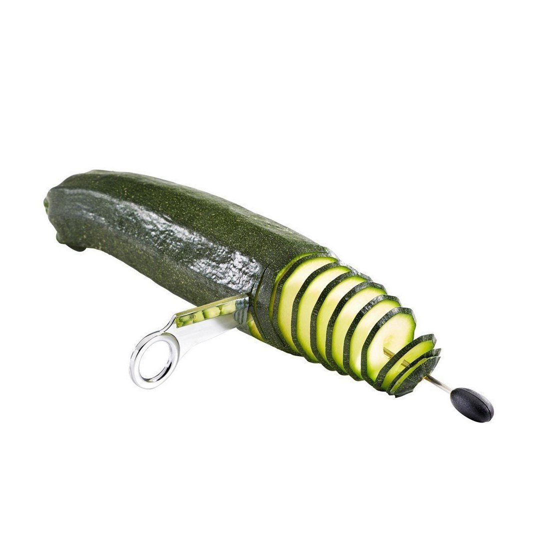 GEFU DEKORATIVNI SPIRALNI REZALNIK RETTIMO vam omogoča rezanje okrasnih rezin zelenjave. Ustvarite krasne spirale iz redkvic, korenja, kumaric, krompirja. Vstavite iglo v živilo, primite za držalo, ki ščiti prste in začnite vrteti. Izdelan je iz nerjavečega jekla, zato ga lahko pomijete v pomivalnem stroju.