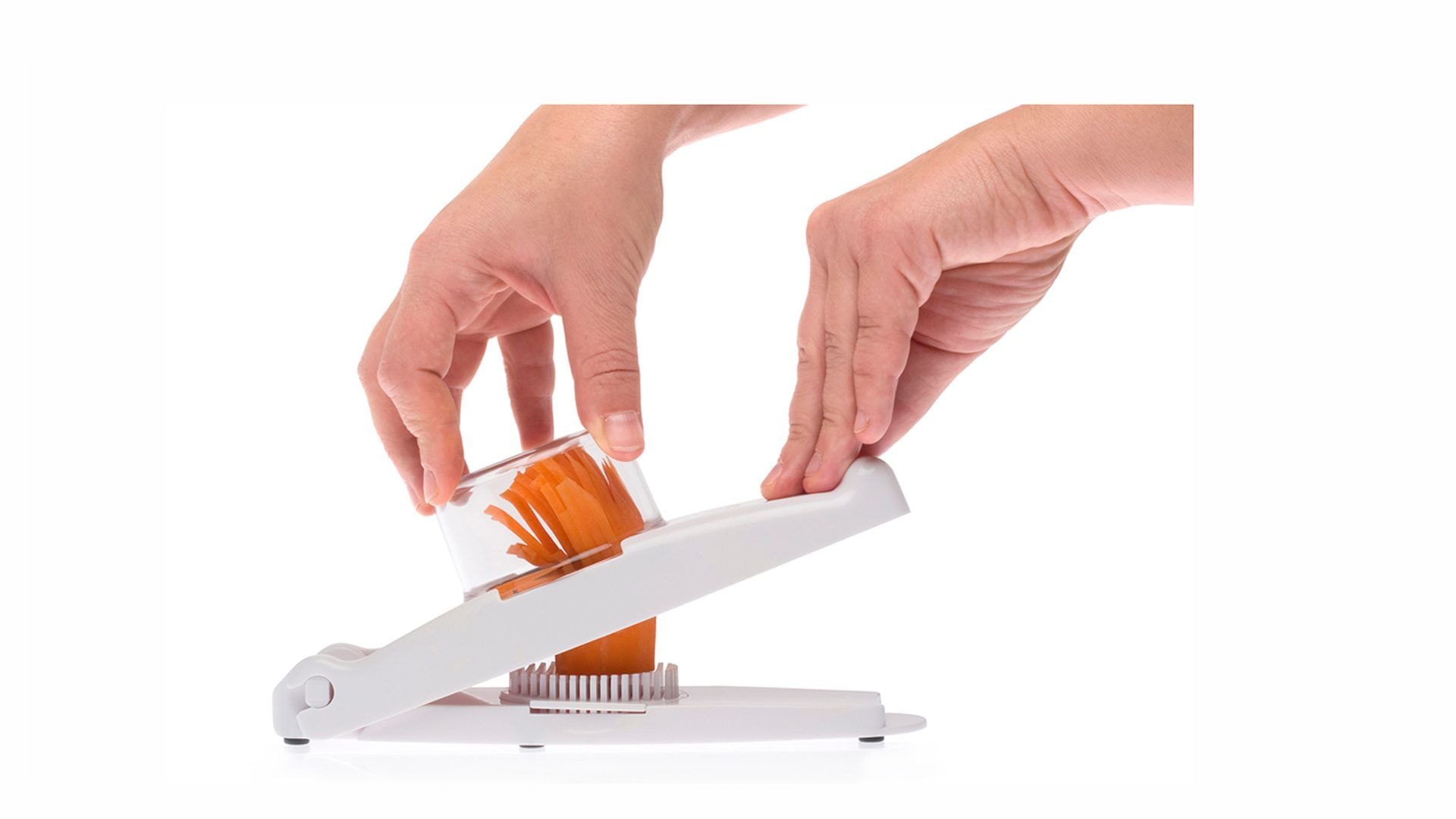 Opremljen je z rezalnimi noži iz nerjavečega jekla, ki zagotavljajo enakomerne kose, velikosti 3 × 3 mm. Narezano živilo se bo ulovilo v za to namenjeno polikarbonatsko posodico, zaradi česar bo vaša delovna površina ostala čista.