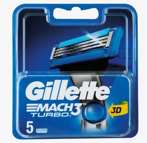 Brivni nastavki priznane znamke Gillette so zasnovani, da nudijo optimalno učinkovitost in tako preoblikujejo vaša pričakovanja glede britja. Komplet vsebuje 5 Gillette Mach3 Turbo brivnih površin s 3 rezili, nad katerimi je tudi trak z gelom, ki pomaga zmanjšati pritisk na kožo za večje udobje in manj draženja. Nastavki so primerni za vse brivnike Gillette Mach3, ena nadomestna glava pa traja za približno mesec britja.