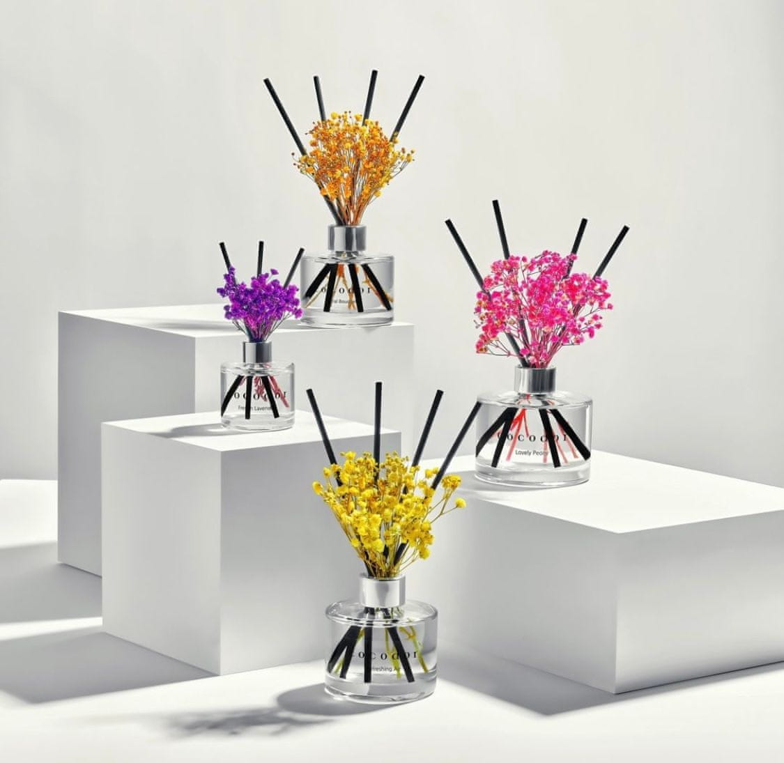 V škatli najdete: eleganten stekleni difuzor (120ml) s priloženimi trsnimi palčkami (5kos) in pravo sušeno cvetje rumene barve.