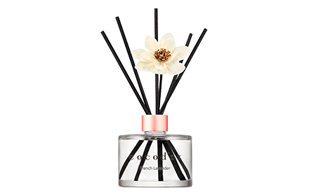 V škatli najdete: eleganten stekleni difuzor (200 ml), 5 črnih trsnih palčk in beli cvet, ki prav tako deluje kot dišeča trsna palčka.
