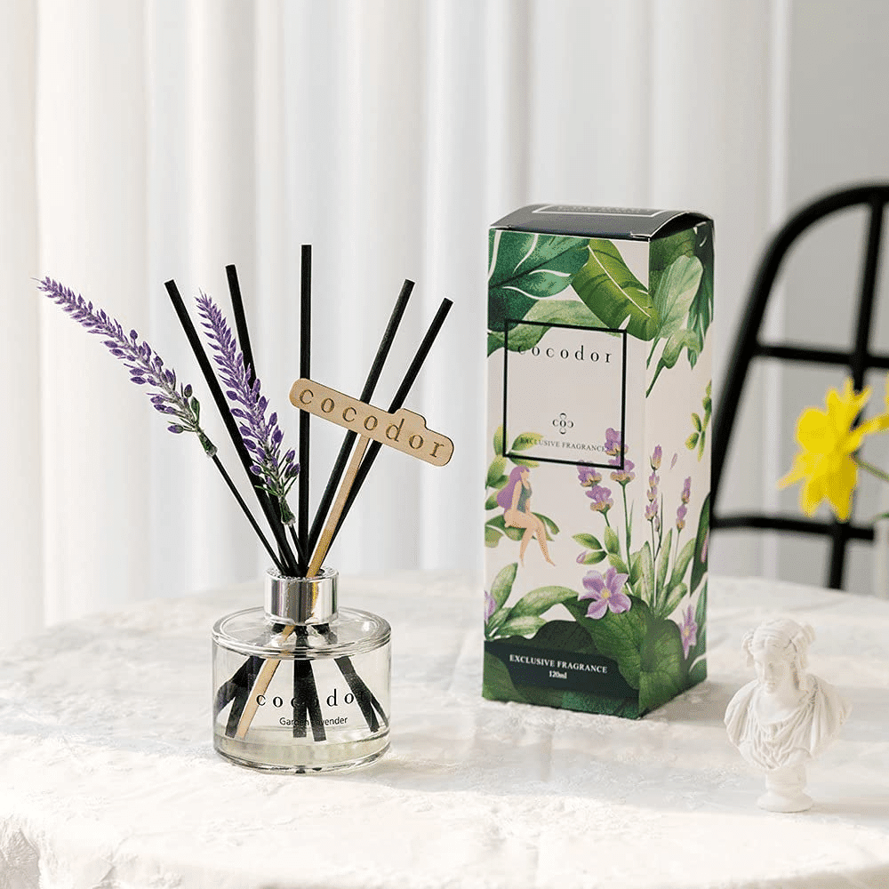 V škatli najdete: eleganten stekleni difuzor, priložene trsne palčke (5 kos), cvetove sivke, evkaliptusove palčke, leseno palčko z logotipom Cocodor in pravo sušeno cvetje.