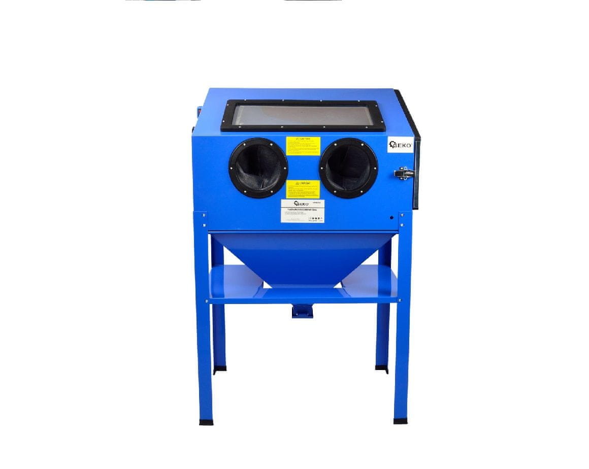 Omara za peskalni stroj 220 litrov, zasnovana za delovanje v zaprtem krogu. Idealna za peskanje majhnih in srednje velikih predmetov.