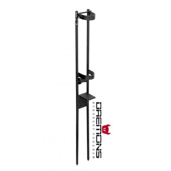 Vrhunsko trdno kovinsko držalo za palice z dvojnim ohišjem, vsako premera 12 mm, izdelano iz trdnega jekla – najmočnejše in najbolj stabilno stojalo za ribiške palice – priprava za pritrditev roke držala indikatorja ugriza, ki ga lahko kupite ločeno kot dodatek k temu stojalu – dolžina držala 750 mm, dva kovinska nosilca za palice, valjček za enostavno odstranjevanje palice s stojala tudi pri res velikem ulovu- varjen kovinski kotnik debeline 6 mm za teptanje ali zabijanje stojala v tla z nabrušenim spodnjim robom- zaskočka iz nerjavečega jekla za zavarovanje palice pred izpadom med velikimi posnetki – pri odstranjevanju palice se zaskočka sama sprosti brez potrebe po dodatnem rokovanju, ročica je s kovinsko verigo pritrjena na stojalo, da se ne izgubi- visokokakovostna obdelava s črno prašno barvo za peko iz komaxita