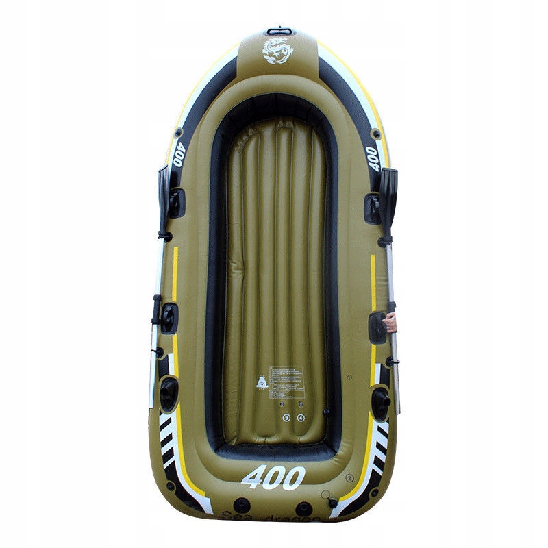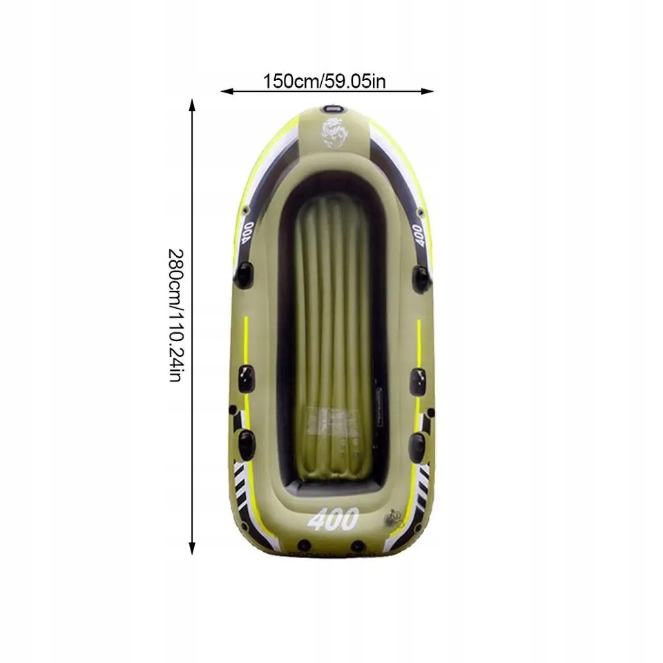 Velik napihljiv čoln FISHMAN 400 za pet oseb je dolg 280 cm in širok 150 cm. Napihljivemu čolnu so priložena vesla, komplet za popravilo, črpalka, vrv in torba za dodatno opremo.