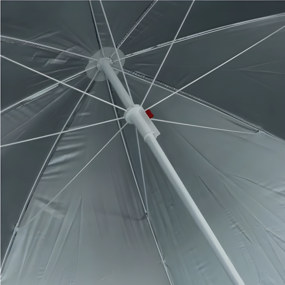☀️ Dežnik je opremljen s koničasto konico za lažje vstavljanje v tla. Ponujamo tudi posebno, privijačeno podlago, ki omogoča trdno vgradnjo dežnika v pesek!