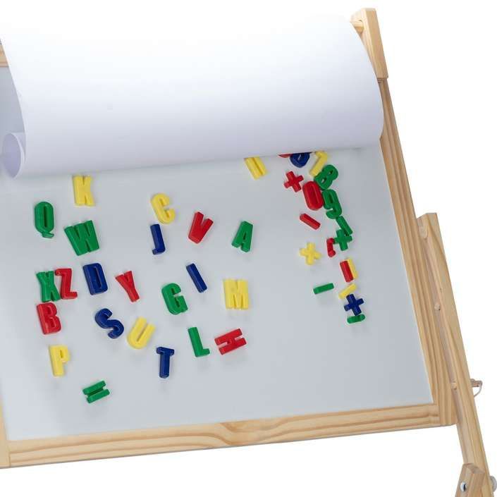 Free2Play obojestranska lesena tabla ima na eni strani površino za risanje s kredami, na drugi strani pa površino za magnetne črke in risanje s flomastri. Z risanjem otroci razvijajo svojo domišljijo in urijo koordinacijo roka-oko.