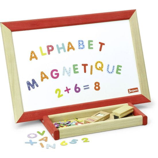 Dvostranska magnetna tabla z lesenim podstavkom, opremljena s prostorom za shranjevanje. Na črno tablo je mogoče pisati in risati s kredo, na belo tablo pa je mogoče pisati s posebej oblikovanimi označevalniki in brisati z gobo iz filca. Izdelano v Franciji iz masivnega bukovega in borovega lesa francoskega porekla. Sestavni deli so obdelani izključno z barvami in laki na vodni osnovi. Pakirano v kartonski škatli, potiskani z rastlinskimi črnili. Vključuje krede, gobico in niz vzorčastih magnetnih črk. Glavne značilnosti:tabla, 3 krede, gobica in komplet magnetnih črkrazmeri table 44×30 cmobračljiva za krede/lepila, magnetnaprostor za zlaganjeizdelano v Franciji