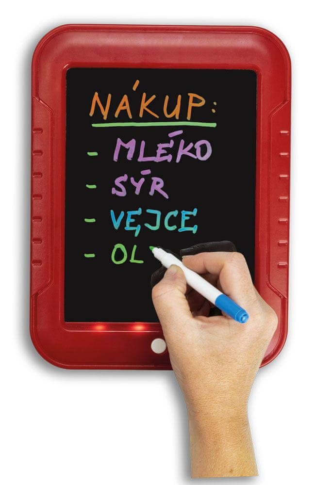 osvetljena tabla, 3 obojestranski neonski markerji, 1 črna karta, 15 obojestranskih kart, krpica za čiščenje