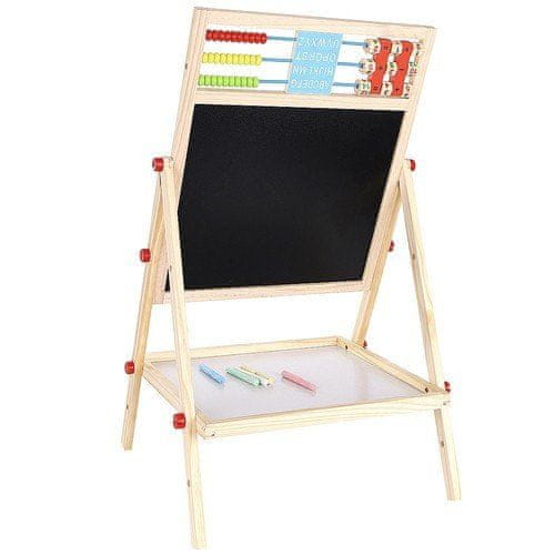 • 6 FUNKCIJ – Dvostranska tabla ima kar 6 različnih uporab. Otroku omogoča slikanje s kredo na črno stransko tablo in slikanje s flomastrom na belo spletno stran. Tabla ima tudi klasičen abakus s perlicami , s katerim bo otrok začel svojo dogodivščino s štetjem. Nato se morda naučite osnovnih matematičnih operacij, kot so seštevanje, odštevanje in množenje. Otrok bo imel tudi uro, na kateri bo lahko poljubno nastavljal čas s pomočjo kazalcev; naučil se bo prepoznati čas. Na tabli je tudi abeceda , ki bo otroku omogočila, da se seznani s prvimi črkami, ki mu bodo kasneje omogočile ustvarjanje prvih besed.