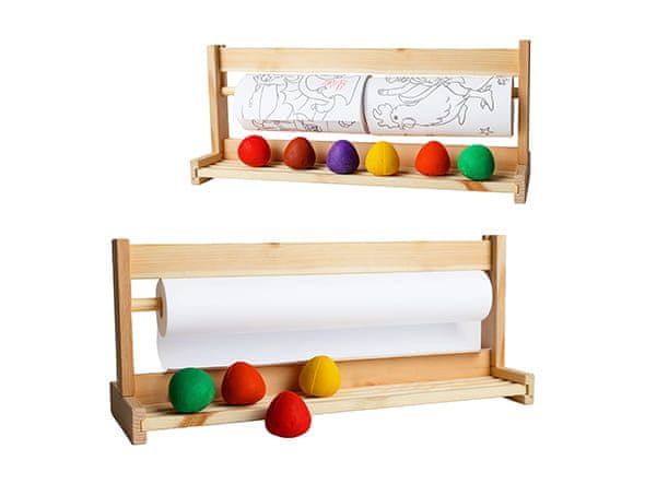 To stojalo za pobarvanke, visoko 48 cm, je izdelano iz lesa in omogoča enostavno odvijanje dveh pobarvank z različnimi temami, kar olajša njihovo organiziranost Ta zasnova preprečuje poškodbe zvitka, kot so gube, raztrganine ali zmočenje Stojalo je opremljeno s praktično polico za barvice in nastavljivim nosilcem ter omogoča natančno trganje izbranih vzorcev brez neravnih robov Je tudi privlačen dodatek k dekoraciji vaše mize Možnost pritrditve praznega risalnega papirja širine 43–44 cm ga naredi funkcionalnega tudi kot velik slikarski list Les je skrbno poliran in lakiran, kar zagotavlja ne le estetiko, temveč tudi varnost pri uporabi