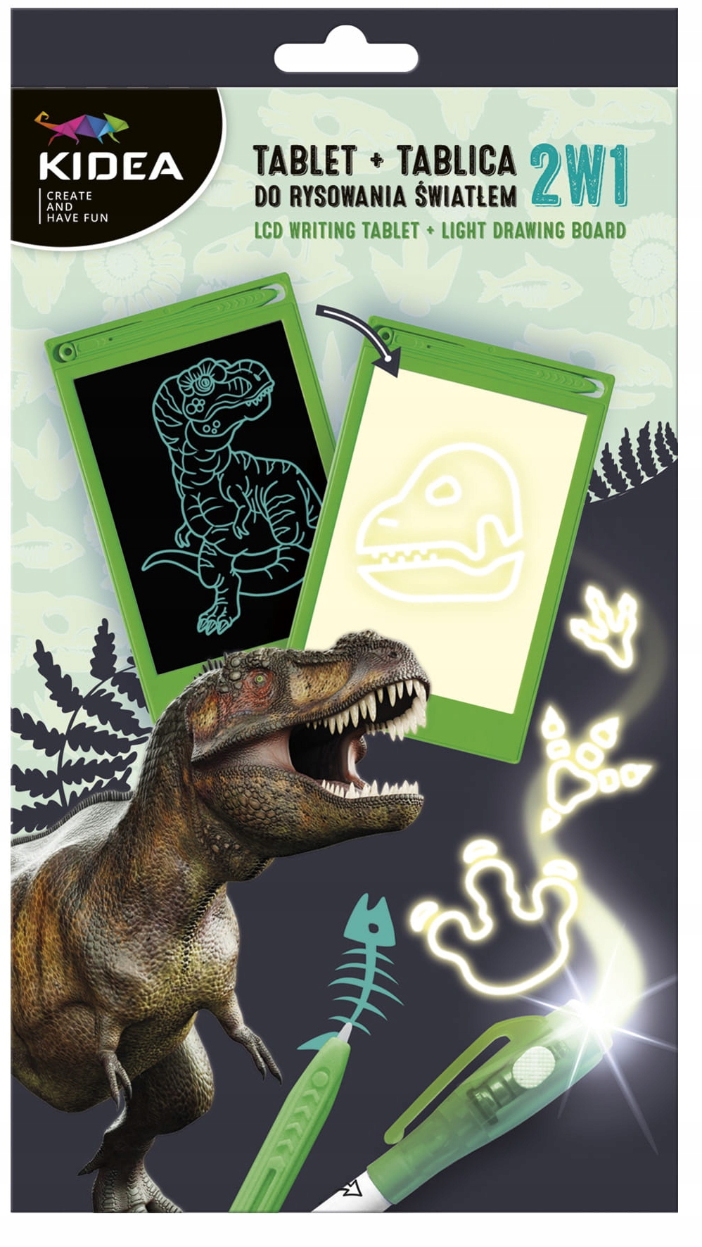 Komplet vključuje svetilko za risanje s svetlobo in šablono z motivi dinozavrov, ki postanejo vidni, ko posvetite na tablo.