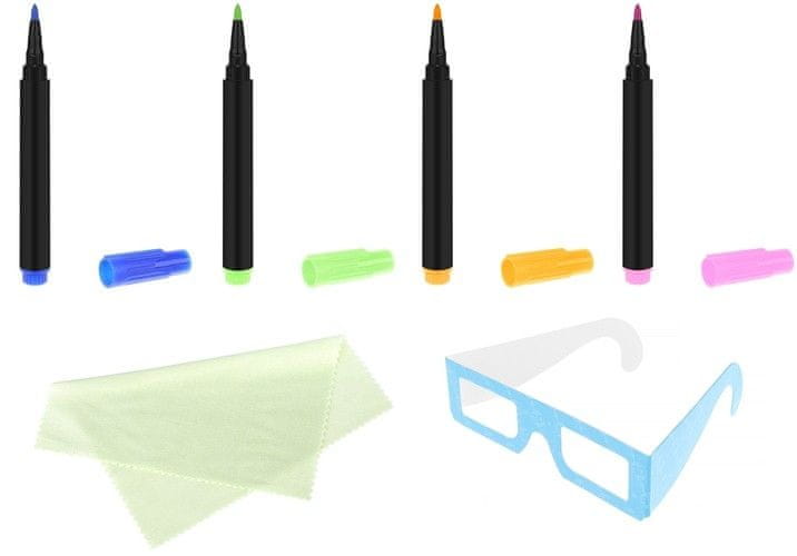 V kompletu so vzorčne risalne šablone, 4 flomastri, stojalo z lučko, steklena tabla, krpa in kozarci. Vse skupaj vas bo popeljalo v 3D svet.
