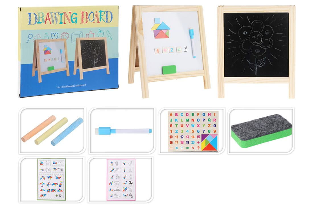 Dvostranska bela tabla – bela in črna stran, z lesenim stojalom. Bela stran je magnetna, črna stran je namenjena risanju s kredo.