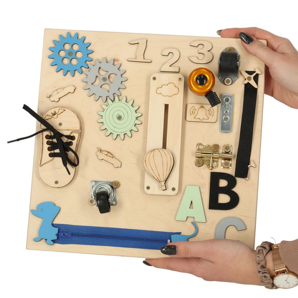 Igrača, ki zagotavlja primeren razvoj in zagotavlja odlično zabavo? Je to sploh mogoče? Seveda! In manipulativne table so dokaz za to! Toda kaj pravzaprav je manipulativna tabla? To je izdelek, ki ima veliko različnih elementov, najpogosteje za vsakodnevno uporabo – med drugim: vtičnica z vtičem, stikalo za luč, kolo in še veliko več! Zahvaljujoč takšnim elementom se bo vaš malček lahko varno seznanil z vsakdanjimi predmeti in se v normalnih razmerah zagotovo ne bi mogel igrati z električno vtičnico! Zaženite, premaknite, drsite, zavežite, vklopite, zasukajte itd. Gre za fantastičen način za vadbo ročnih spretnosti, ki bo zagotovo zelo uporaben v prihodnosti, na primer pri učenju pisanja. Še več, tabla za zabavno manipulacijo & nbsp; Vadi tudi koncentracijo, koordinacijo rok in oči, spodbuja domišljijo in uči vzročno-posledično razmišljanje. Zaključek je preprost – ta igrača prinaša samo koristi! s posebej za to oblikovanimi obeski. > Pisane, premikajoče se prestave, Zadrga, kolo, Dve vrsti banov, čevelj z vezalkami (vezkami), Lesene številke, Različne lesene črke, Gibljivo in vrtljivo pohištvo, suha suha suha suha suha površina, Pot z gibljivim balonom. Vsebuje samolepilni filc, ki preprečuje vlečenje podlage. služi dolgo časa! > Mere: Miza: 30 cm x 30 cm Pakiranje: Izdelek pakiran v kartonsko embalažo.