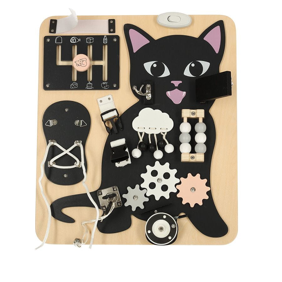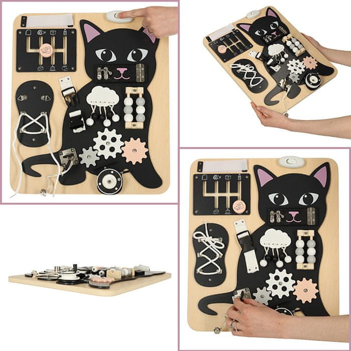 TABELA SENZORIČNE MANIPULACIJE KITTEN LULILO KICIAO Skrb za pravilen razvoj otroka je odgovornost vsakega starša. Za skrb za otrokovo učenje se splača uporabljati vse vrste pripomočkov, kot so manipulativne table! Ta neverjetno priljubljena vrsta igrače bo vašega otroka spodbudila k vrtenju, vlečenju, zavezovanju in premikanju! Množica aktivnosti bo najmlajšim omogočila, da razvijejo številne spretnosti! Natančni gibi, ki jih zahteva igra, bodo koristili številnim različnim spretnostim. Omogočili vam bodo izboljšanje motoričnih sposobnosti prstov, natančnost njihovega gibanja, pa tudi razvoj mišic in moči rok. Velika izbira nalog in ugank bo spodbudila razvoj kognitivnih sposobnosti najmlajših. Nekatere od njih bodo zahtevale trenutek razmisleka in iskanje rešitve bo otroku prineslo veliko zadovoljstvo! Prijeten dizajn in ljubek maček bosta pritegnila vsakogar, šumeči, žvenketajoči in klikajoči dodatki pa bodo obdržali pozornost še tako nemirnega otroka! Ta senzorična tabla bo vašega otroka naučila zavezovati vezalke, zapenjati zaponke in celo uporabljati ključe! Tako se boste lažje naučili preprostih vsakodnevnih dejavnosti! Vsi elementi so trpežni, kar zagotavlja resnično zadovoljivo vzdržljivost. Preživeli bodo mnogo ur vlečenja, zavezovanja in trkanja! Nobenega dvoma ni, da je manipulativna tabla zagotovilo za odlično zabavo in učenje v enem! Material: les s plastičnimi in kovinskimi elementi Dimenzije: Plošča: 40 cm x 35 cm x 1,5 cm Mačka: 20 cm x 38 cm Pakiranje: 4 2 cm x 37 cm x 7 cm Pakirano v estetski kartonski škatli.