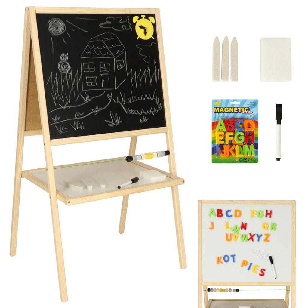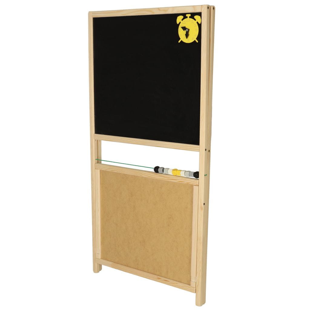 Lesena izobraževalna tabla, velikosti 37 × 48 × 90 cm, združuje funkcijo črne table za pisanje s kredo in bele magnetne table, ki podpira razvoj pisanja in računanja. Tabla ima poličko za dodatke in vsebuje komplet dodatkov: tri krede, marker, gobico za brisanje ter magnetke v obliki črk.