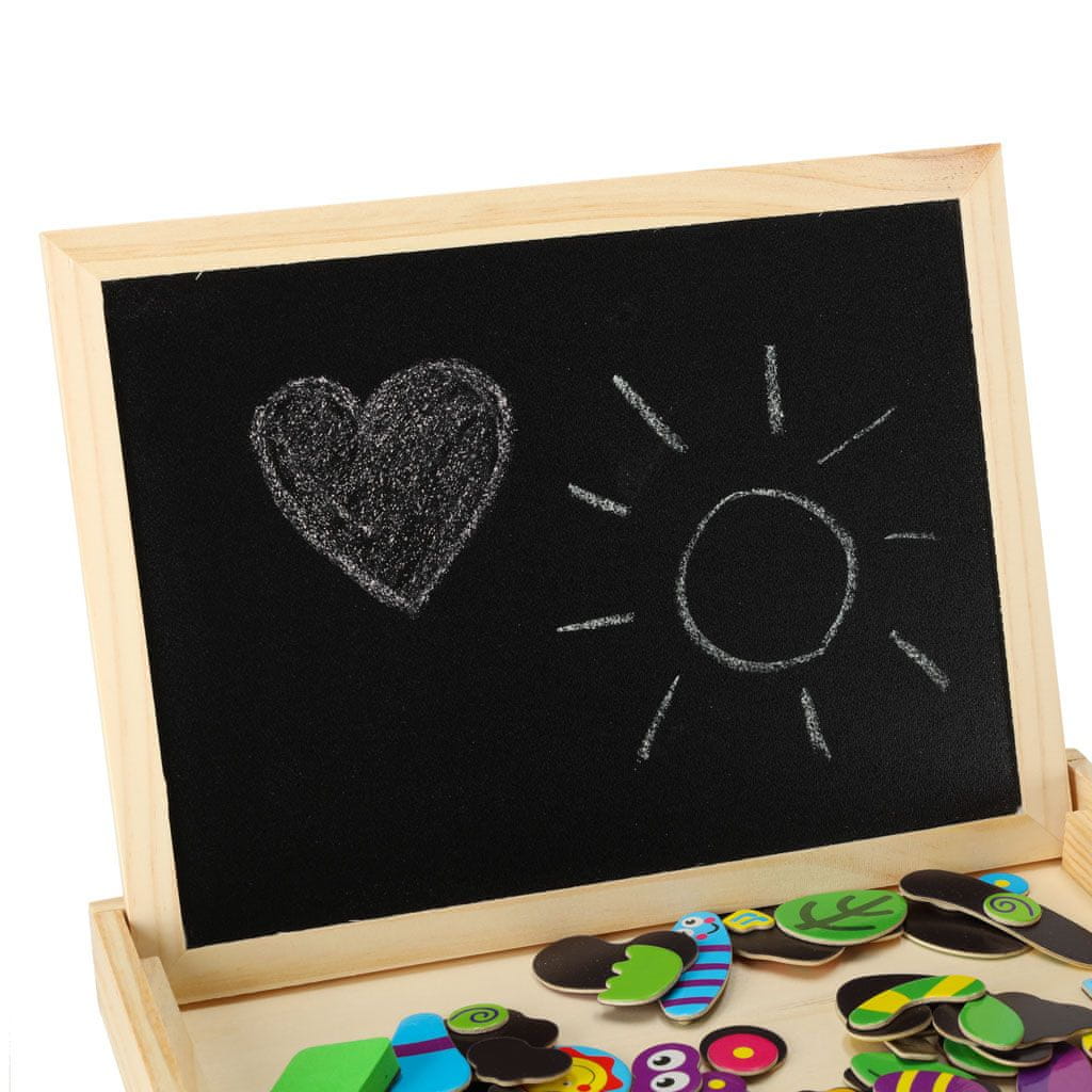 IZOBRAŽEVALNA VELIKA VEČFUNKCIONALNA TABLA MODEL D MAGNETNA KREDA Z UGANKAMI Obojestranska lesena tabla z magnetnimi ugankami za urejanje slik. Z zabavno zabavo razvija otrokovo iznajdljivost in domišljijo. Okvir iz svetlega naravnega lesa. Mere: 30 cm dolžine 23 cm širine 3 cm višine Dve funkcionalni tabli: Bela magnetna stran se uporablja za urejanje pisanih ugank in pisanje z markerjem Črna stran table se uporablja za klasično pisanje s kredo Set vsebuje: dvostransko tablo komplet približno 100 magnetov barvne krede gobo flomaster navodila z vzorci sestavljank