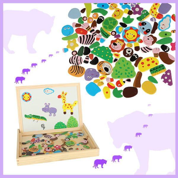 IZOBRAŽEVALNA VELIKA VEČFUNKCIONALNA TABLA MODEL C MAGNETNA KREDA Z UGANKAMI Obojestranska lesena tabla z magnetnimi ugankami za urejanje slik. Z zabavno zabavo razvija otrokovo iznajdljivost in domišljijo. Okvir iz svetlega naravnega lesa. Mere: Okvir iz lahkega naravnega lesa. 30 cm dolžina 23 cm širina 3 cm višina Tabla z dvema funkcijama: Bela magnetna stran se uporablja za urejanje pisanih ugank in pisanje s flomastrom Črna stran table se uporablja za klasično pisanje s kredo Set vsebuje: dvostransko tablo komplet približno 100 magnetov barvne krede gobo marker navodila z vzorci sestavljank
