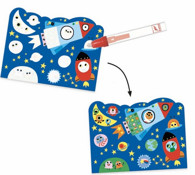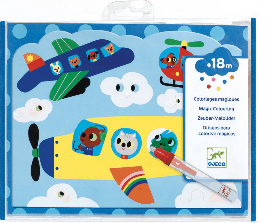 Slikanje s čarobnim svinčnikom s slikami, ki se ponovno pojavijo. Vozila v zraku na 4 slikah velikosti 21×26 cm se pojavijo šele po ponovnem slikanju s čarobnim svinčnikom. Svinčnik je pred nanosom napolnjen z vodo, kar omogoča, da se slike pojavijo v svetlih barvah. Čudovito obarvana slika bo ostala nepokrita, dokler se vsa nanesena voda ne posuši. Ko se posuši, se slika ponovno obloži z belo, neprozorno barvo in otroci jo lahko ponovno odkrijejo. Neskončna zabava bo otroke zabavala in zaposlila na dolgih in kratkih potovanjih. Komplet vsebuje: 4 slike, čarobni svinčnik, krpo Vse skupaj je zavito v praktično embalažo z zapiranjem, tako da se tudi na poti nič ne izgubi, otroci pa lahko skozi prozorno embalažo opazujejo postopno spreminjanje slike. Primerno za otroke od 18. meseca dalje.