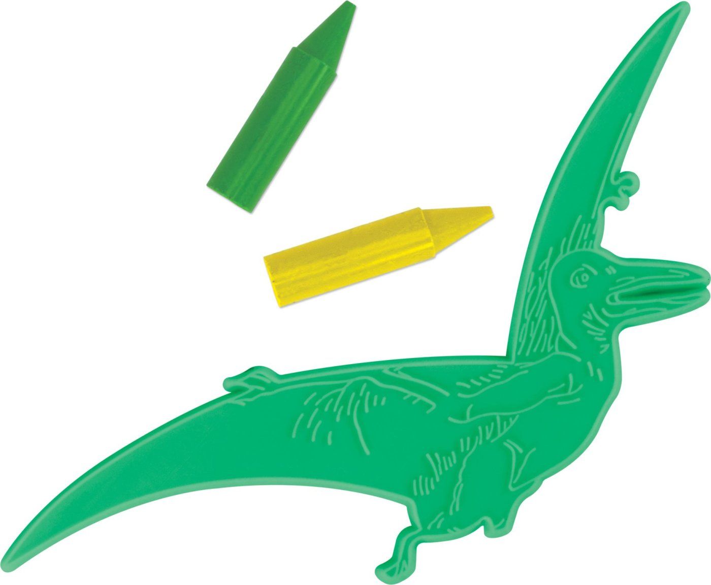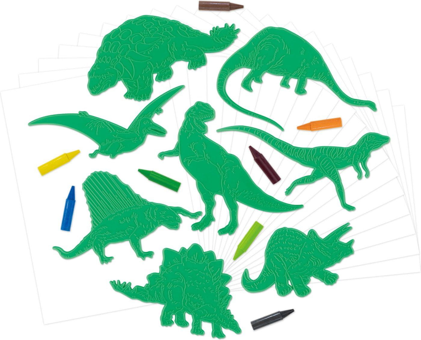 Šablone vključujejo realistične oblike dinozavrov, ki jih otroci zlahka obrišejo in pobarvajo, različne tehnike: kot nalašč za trenje z voskom, sledenje in nato barvanje, postopoma lahko otroci preidejo na bolj zapletene risbe, kolaž in blok tisk, umetniške možnosti: z uporabo lastnih barv lahko slike prenesejo na papir ali tekstil in tako razširijo možnosti ustvarjalnega izražanja, s tem ustvarjalnim kompletom ustvarite neverjetna umetniška dela, polna domišljije in zabave, kot nalašč za male umetnike in ljubitelje dinozavrov.