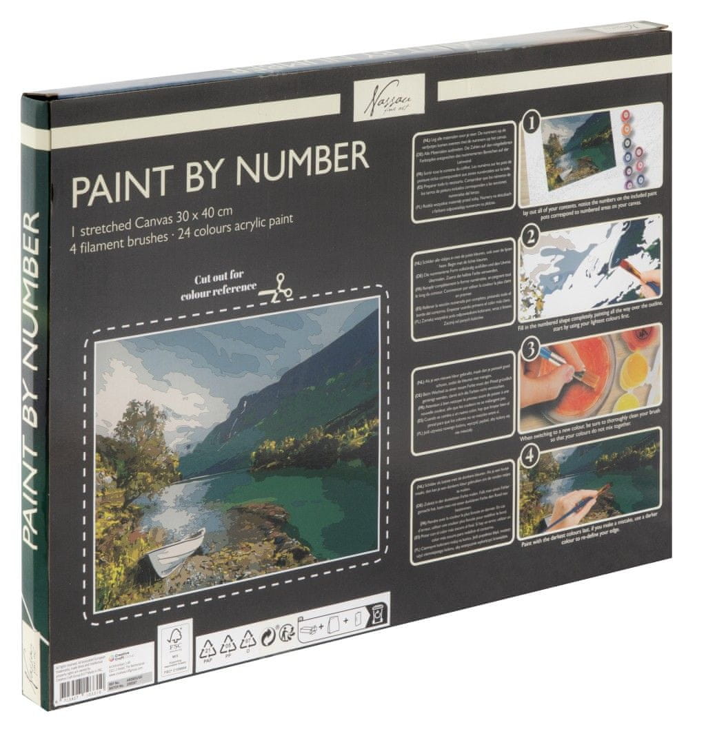 Slikanje po številkah na platno Pokrajina 30 × 40 cm – naslikajte svojo sliko z že natisnjenimi številkami. Paket vsebuje 24 akrilnih barv, platno velikosti 30 × 40 cm z vnaprej natisnjenimi številkami, 2 ploska čopiča in 2 okrogla čopiča.